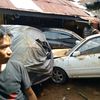 Warga yang panik terendam banjir bandang tampak berusaha menyelamatkan harta benda mereka agar tidak hanyut terseret banjir.